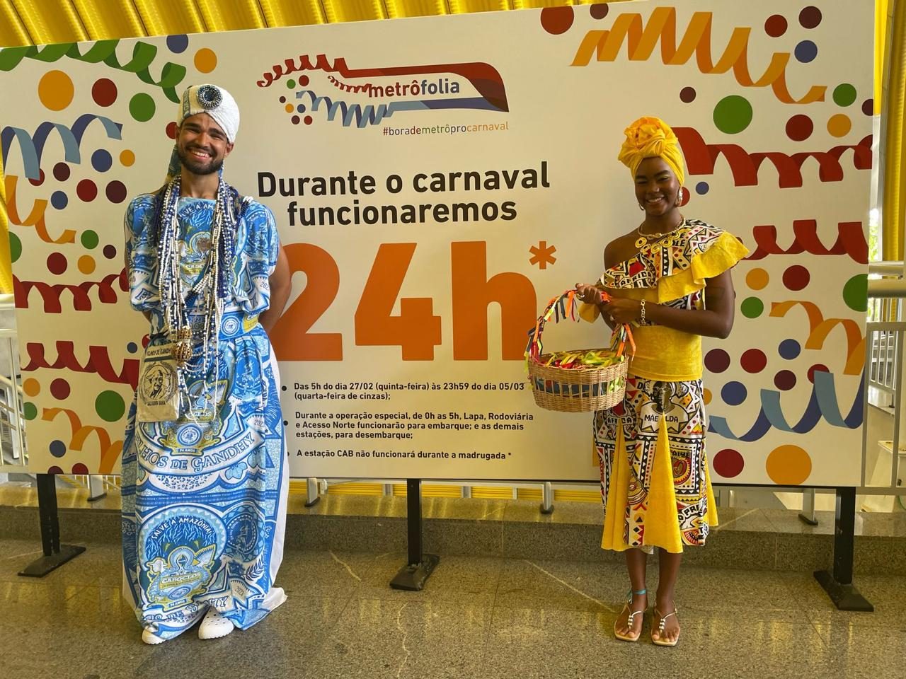 Nos dias 12 e 13 de fevereiro, na Estação Aeroporto, das 9h30 às 11h30 e das 14h às 16h, será realizado receptivo temático bilíngue com distribuição de Guias Turísticos do Metrô, com foco na orientação de visitantes que chegam à cidade para o Carnaval.