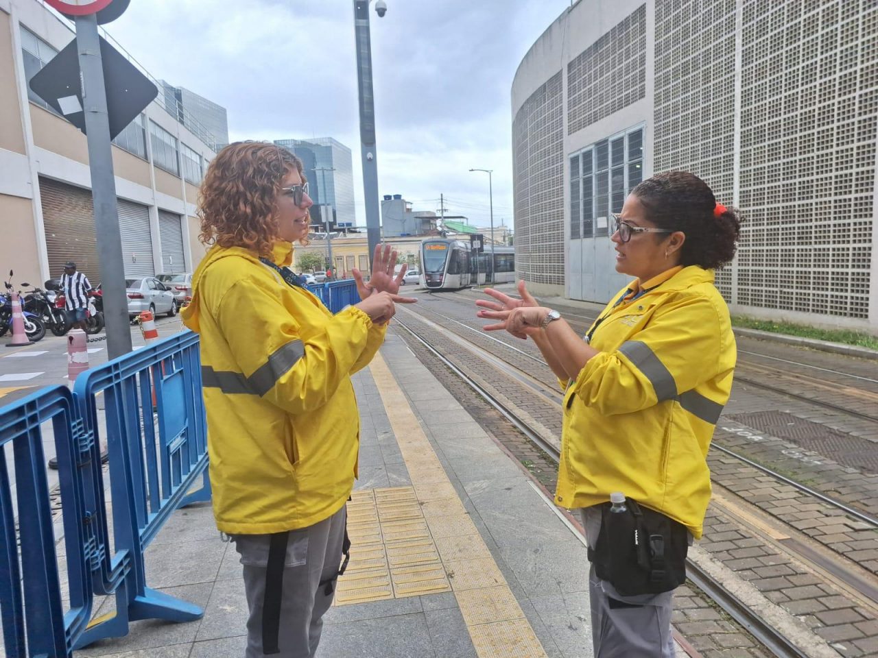 Legenda da foto: (da esq para a direita) Katharine Santos e Nívea Lisbôa, agentes de fiscalização do VLT Carioca, conversam na linguagem brasileira de sinais na parada Vila Olímpica.